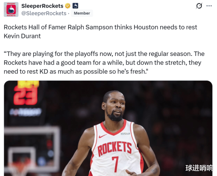 火箭名宿桑普森对此一针见血的点评道:“火箭该为季后赛而战,不要仅仅着眼于常规赛,他们必须尽可能让杜兰特获得更多休息时间,确保他以满血状态出战季后赛。”