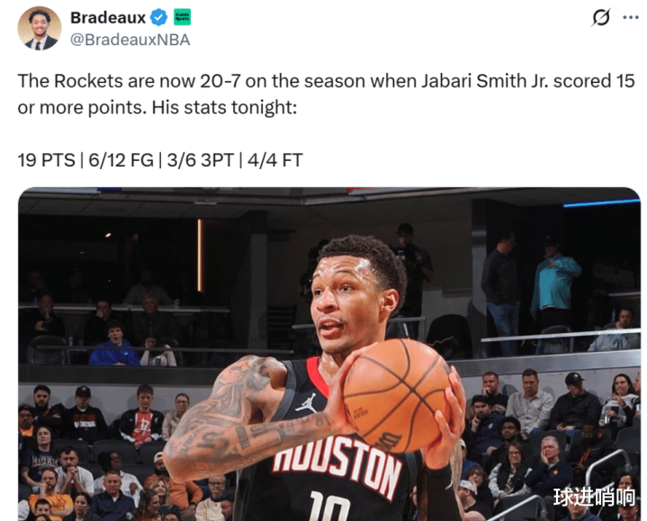 全场12中6,三分6中3,交出19分4板1助1断1盖帽全能数据,当他本赛季得分15+时,火箭队战绩为20胜7负。
